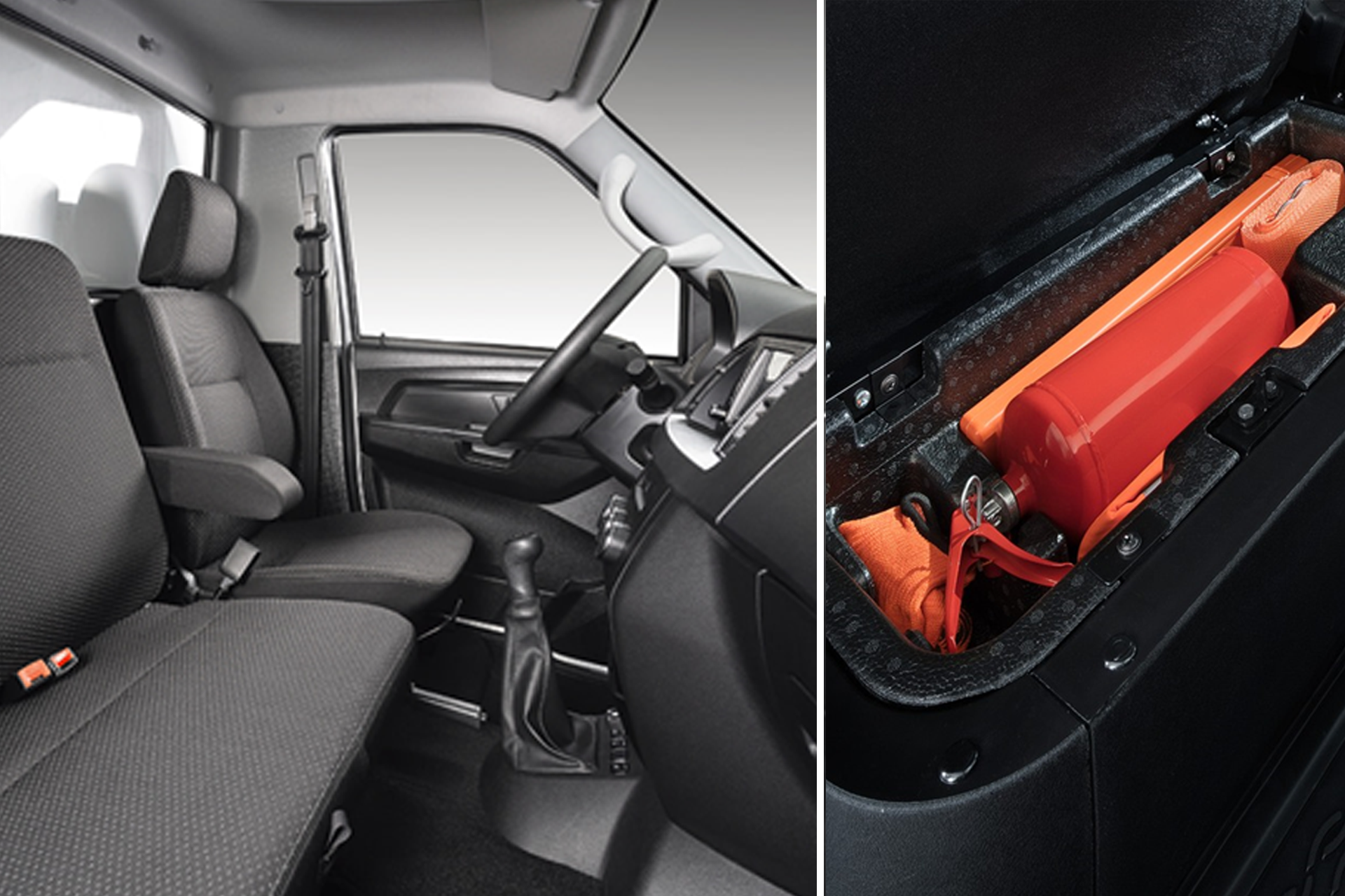 Вместительный органайзер под двухместным сиденьем со штатным размещением огнетушителя.
